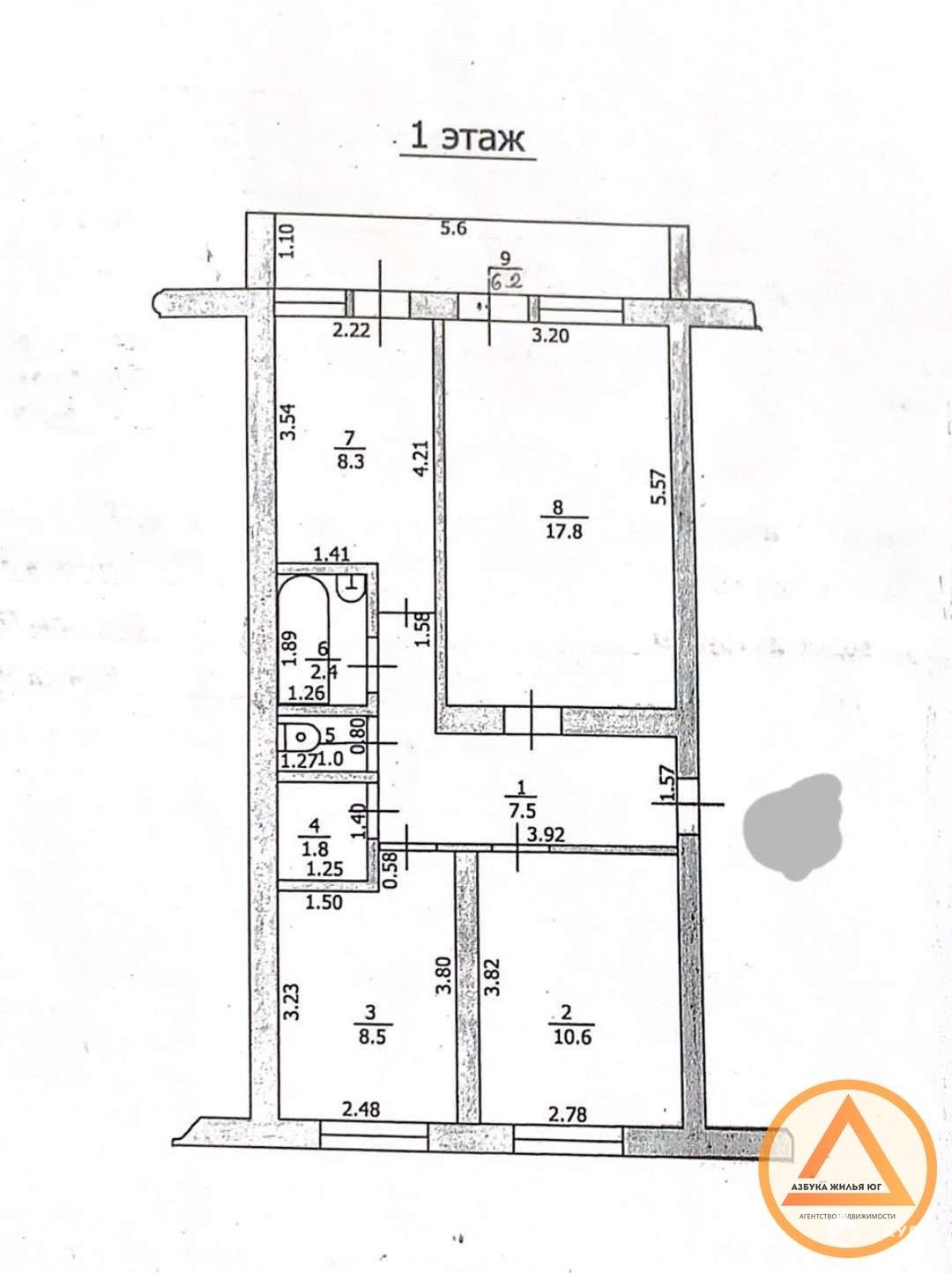 Общая площадь — 57, 9 кв.м., кухня — 8, 3 кв.м.