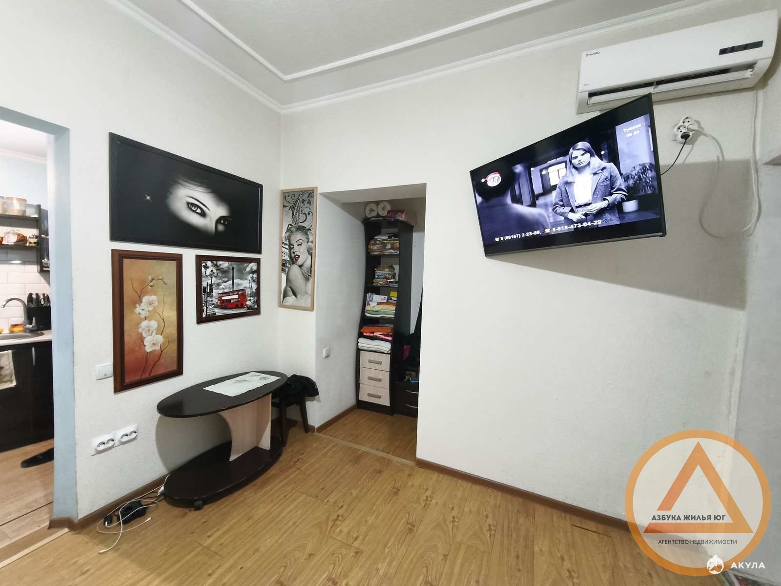 В комнате есть раскладной диван и плазменный телевизор. Также есть отдельная ниша, которую можно использовать как гардеробную.
